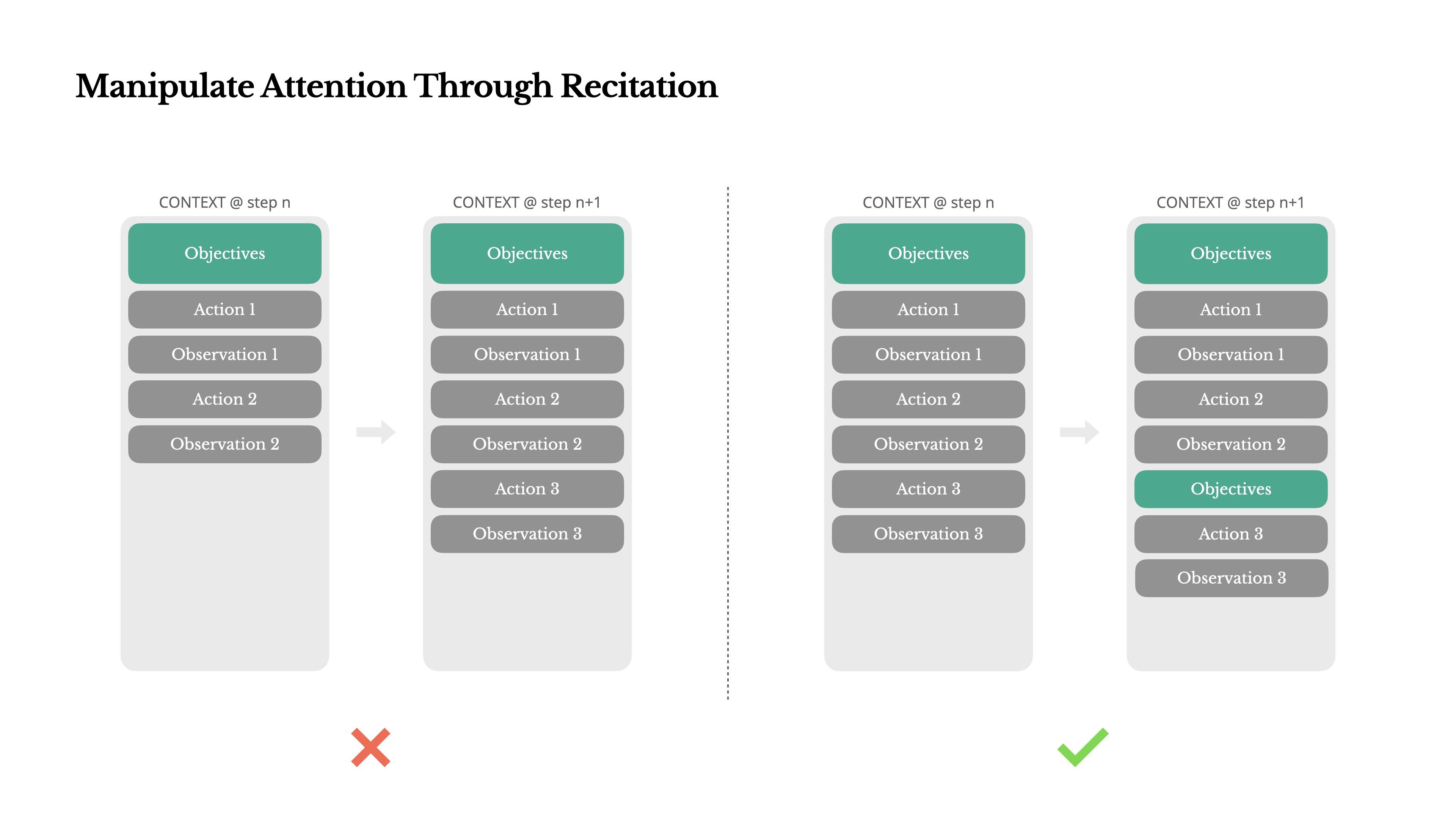 通过不断重写待办事项列表,Manus 将其目标重复写入上下文的末尾。这会将全局计划推入模型的近期注意力范围,从而避免“迷失在中间”的问题,并减少目标错位。实际上,它正在使用自然语言来引导自己的注意力集中在任务目标上——而无需特殊的架构更改。