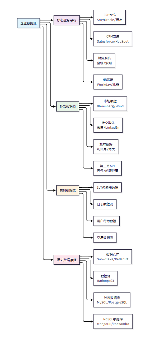 现代企业的数据生态系统呈现出多样化、复杂化的特征。从数据来源角度分析,主要包括以下几类: