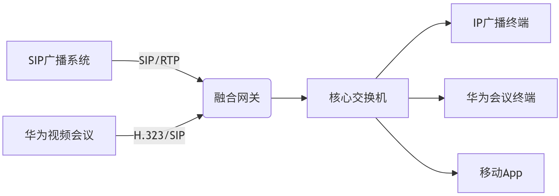 融合原理:SIP 是一种基于文本的应用层协议,具有跨平台兼容性,可对接不同厂商的设备,支持单播、组播、广播等多种通信模式。华为视频会议系统支持 SIP 协议,通过该协议可将广播对讲终端与视频会议终端接入同一网络,由统一的管理平台进行管理,实现功能联动。