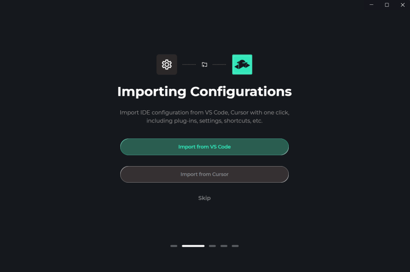 如果没有考虑好,可以先skip跳过。后续可以在"General"进行设置。原文:"lmport lDE configuration from VS Code, Cursor with one click, including plug-ins, settings, shortcuts, etc."中文:"从VS Code导入IDE配置,一键获取光标位置、插件、设置、快捷键等。"