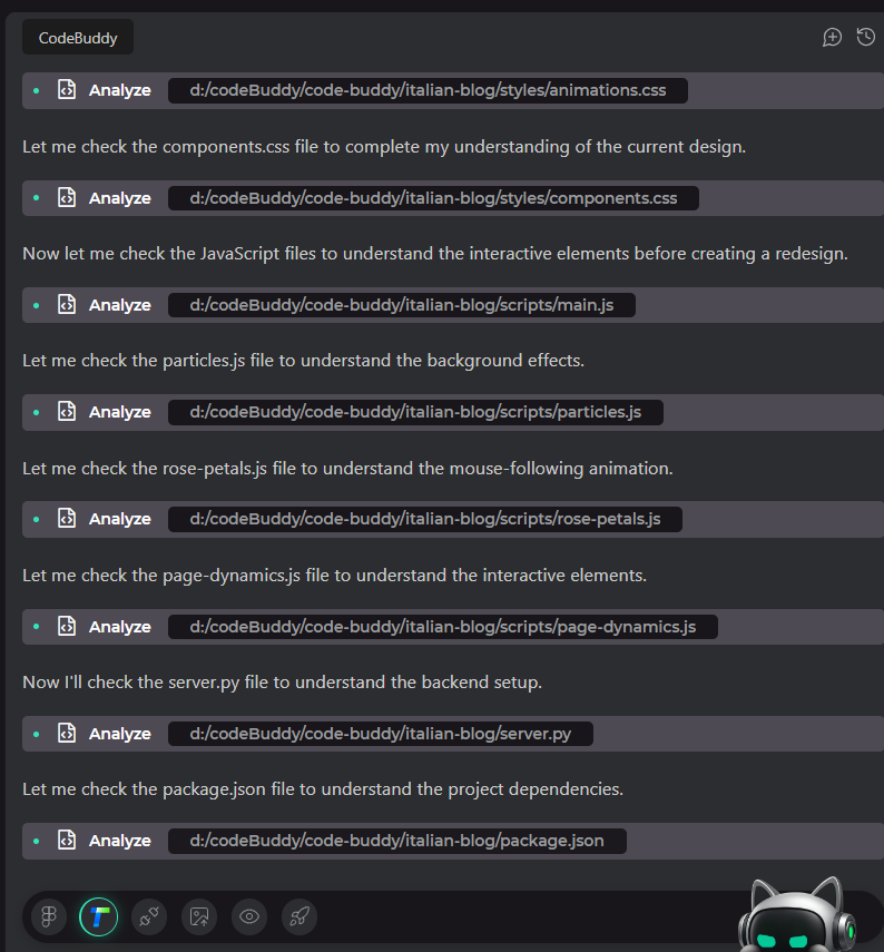 这个‘Boost Prompt’功能,似乎其他AI没有提供,目前我只在‘影刀魔法工具’的内置AI中看到。很高兴在‘CodeBuddy’上也看到了这个功能。这功能非常实用。如果请求不够详细,AI可能无法给出你想要的答案,最终就像是对牛弹琴,效果完全达不到。