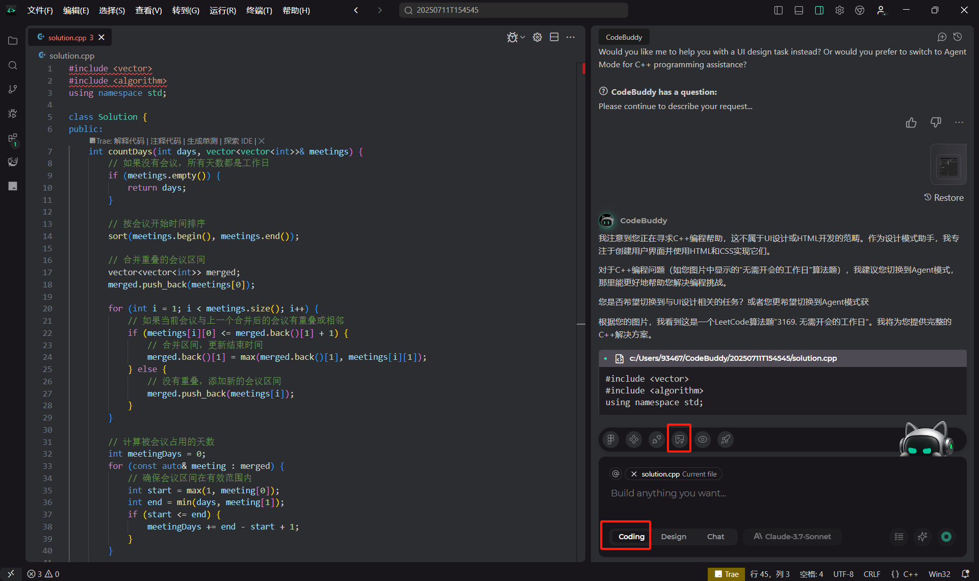 这里切换到"Coding模式"分析图片题目,然后生成代码。