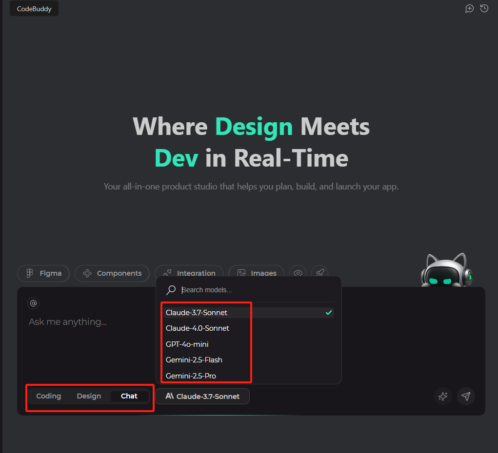 Coding Design Chat 作为一体化AI全栈工程师工作流程中的关键环节,实际上包含三个不同的工作模式,每个模式针对不同的设计到代码转换场景。同时也是"CodeBuddy "作为AI全栈工程师的底气。
