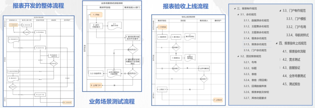 项目组首先制定《报表制作规范》《报表验收上线规范》,涵盖命名规则、布局要求、测试流程等12个细分章节。例如,在数据源命名规范中,明确要求“主题表需包含业务域 + 业务场景 + 数据周期”(如营销 - 电费抄核收 - 日报);在业务场景测试流程"中,设置功能演示 - 逐项检查 - 全流程模拟三重验证,确保每个报表上线前都经过用户视角的严苛检验。这套规范不仅让开发效率提升40%,更成为国网某省电力数据治理的重要参考模板。