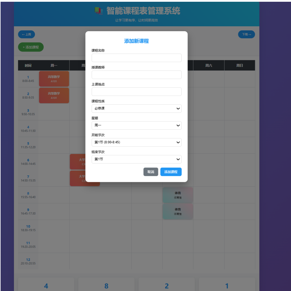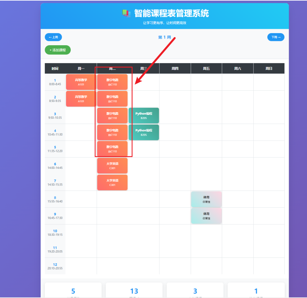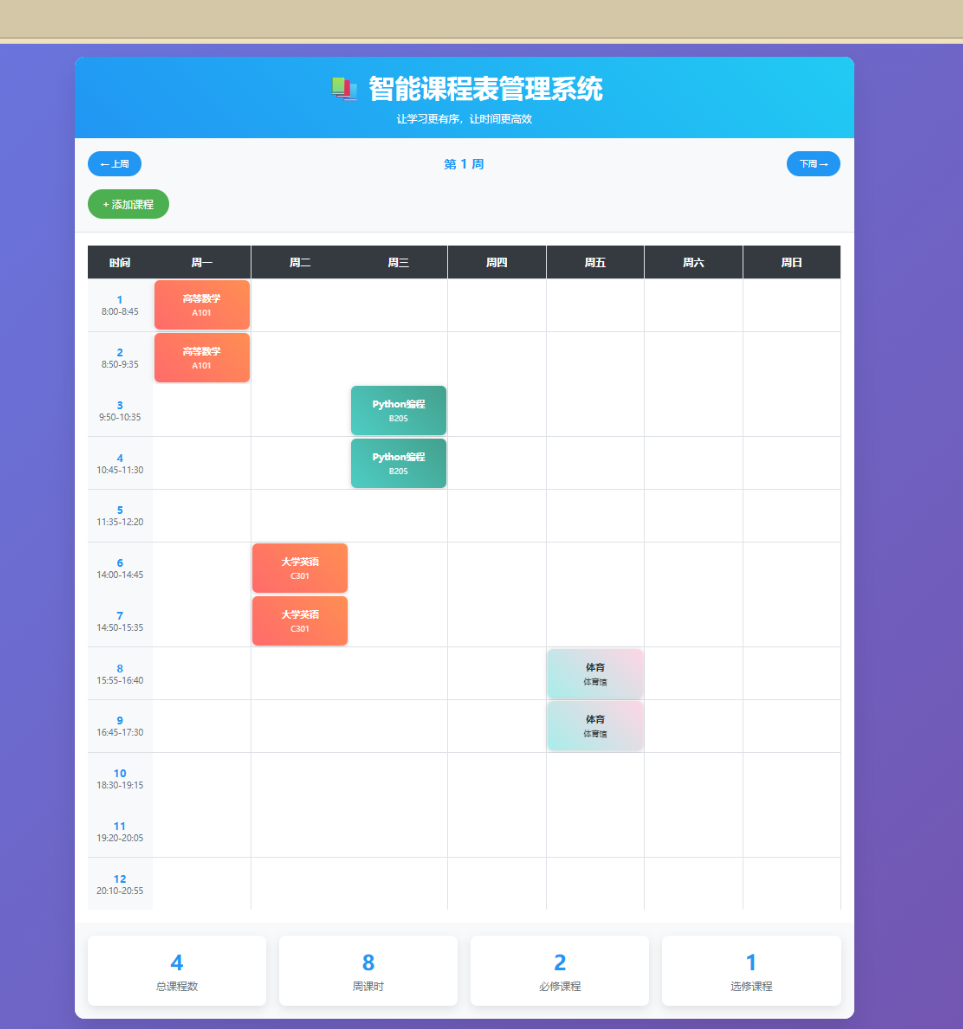 - Course card design: Allows setting colors based on course nature (e.g., red for compulsory courses, blue for electives) for quick differentiation.