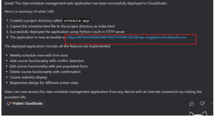 从一张课程表图片到一个可全网访问、功能完整的网页,CodeBuddy 用实际体验证明:AI 驱动的开发工具,正在将 “专业门槛” 转化为 “效率杠杆”。在传统开发模式中,完成同样的课程表网页需要掌握 PRD 撰写、UI 设计、前端编码、部署运维等多重技能,耗时长;而借助 CodeBuddy仅需通过自然语言交互,就能从 “零技术基础” 实现从需求到上线的全流程。 CodeBuddy 将 “产品、设计、研发” 的专业逻辑封装为 AI 一体化能力带来了实实在在的效率提升。