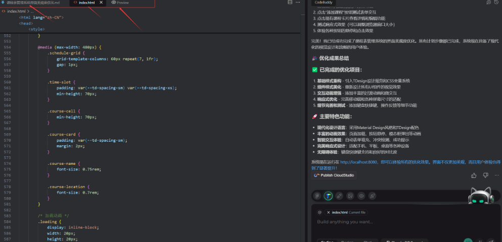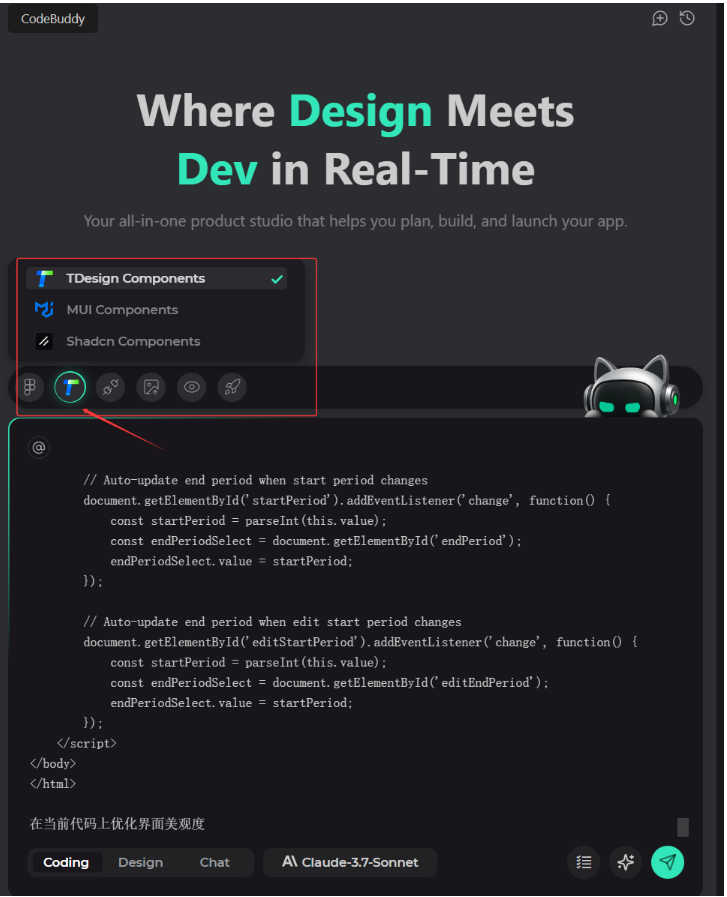 codebuddy给我们提供组件库选择与调用能力,助力开发者快速搭建界面。有TDesign Components、MUI Components、Shadcn Components主流组件库可以选择,适配不同技术场景。将我们原本的课程表页面代码交给codebuddy。选择腾讯开源的企业级设计体系TDesign,其与 CodeBuddy 协同工作、深度融合,复用成熟组件库,减少重复开发。