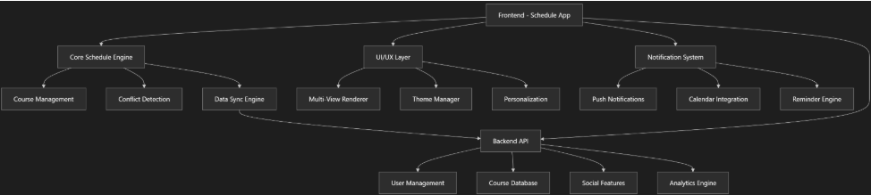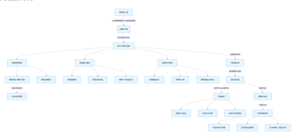 - Automatically switches modes near exam weeks, hides non-exam courses, highlights exam subjects, times, and locations, and is paired with a "review countdown" tool. AI给我们制作了一个网页设计架构图