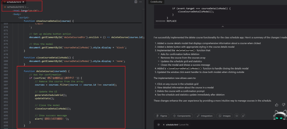 这里我没有进行任何别的操作,已经帮我在原代码中添加了“删除课程”的功能,并在左边把修改后的代码呈现出来