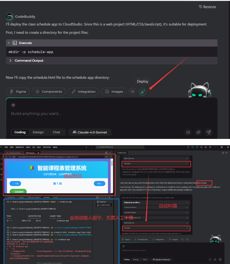 但是codebuddy给我们提供了一键部署deploy功能,还能自动纠错,全自动化实现非常方便。