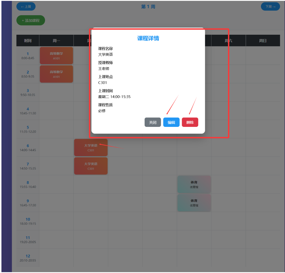 点击课程,看见多了删除和编辑的功能。在原命令中只要求了删除功能,但是它很周全的考虑到了,课程可能还需要编辑功能!