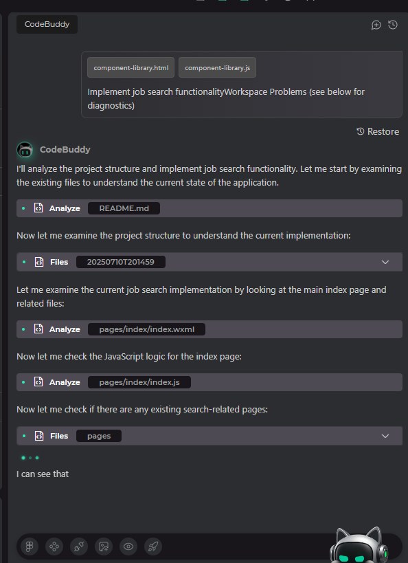 例如,我输入“Implement job search functionality”,AI助手自动帮我补全过滤逻辑代码,连带前端绑定数据,节省30%开发时间。