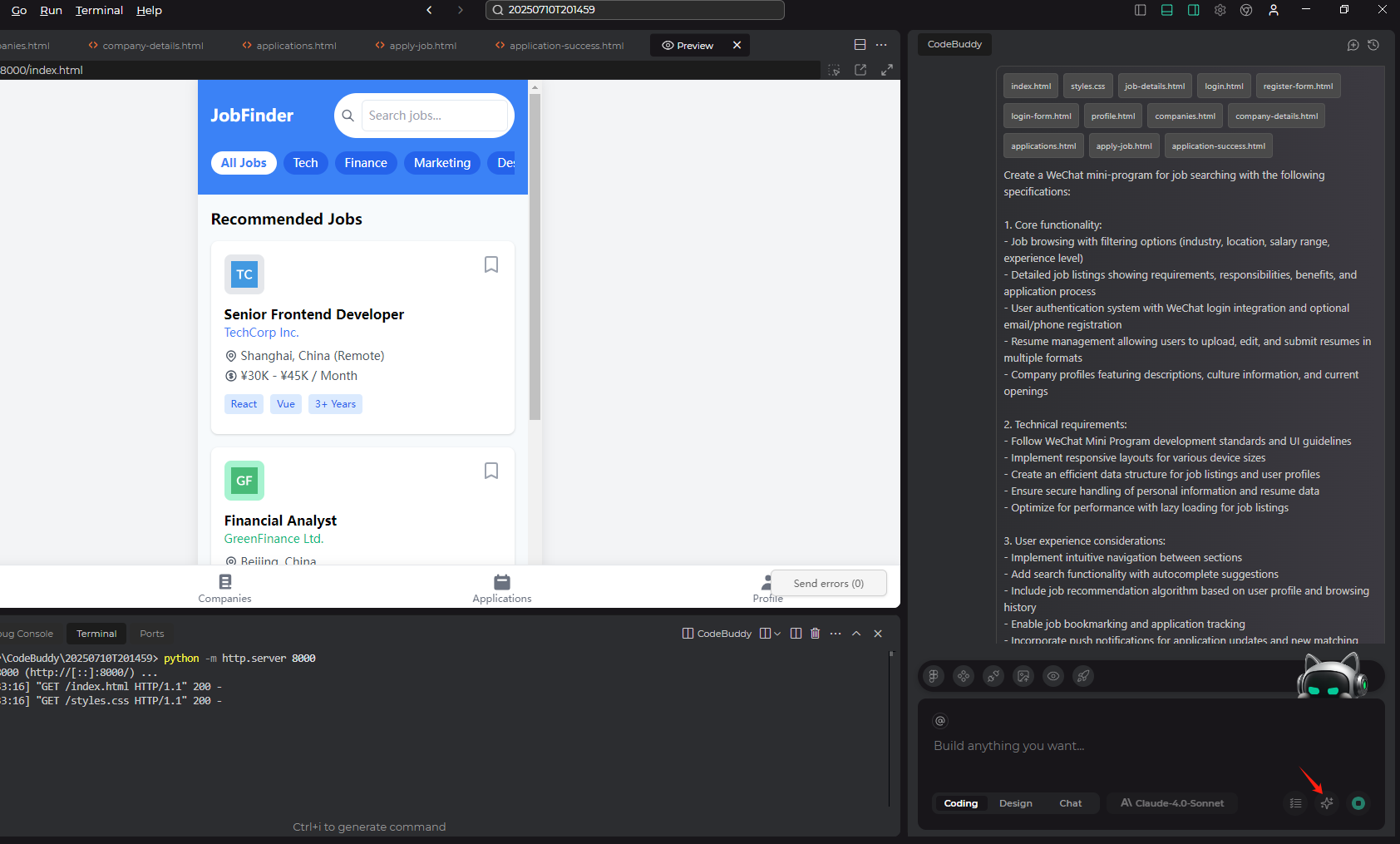 CodeBuddy IDE以产设研一体化理念,结合AI智能、设计深度融合和云原生后端,彻底革新了招聘小程序开发流程: