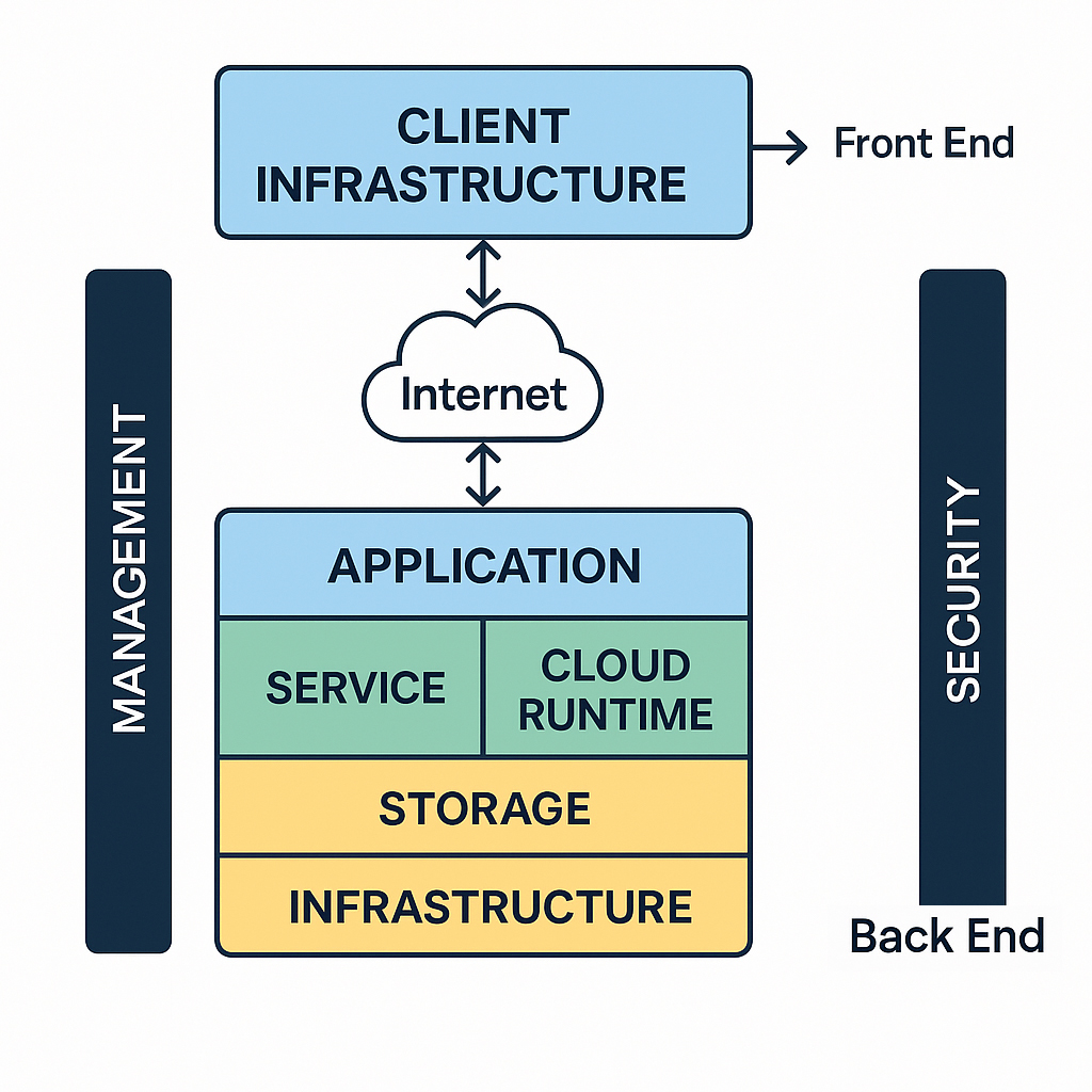 Top Layer (Client Infrastructure):Place a rectangular box at the top labeled "Client Infrastructure". Add an arrow pointing right labeled "Front End".