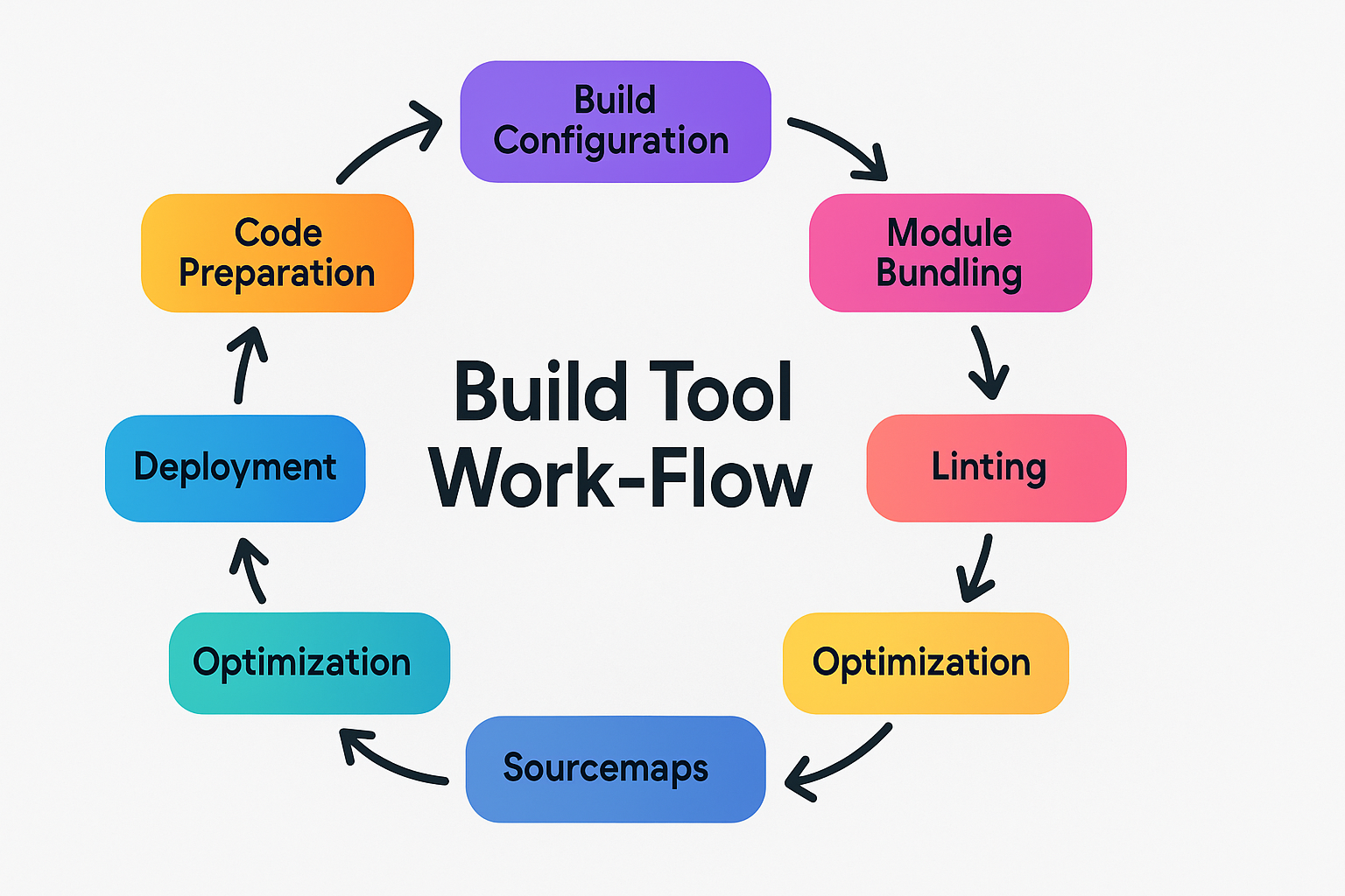 Code Preparation, Build Configuration, Module Bundling, Transpiling, Linting, Optimization, Minification, Sourcemaps, Deployment