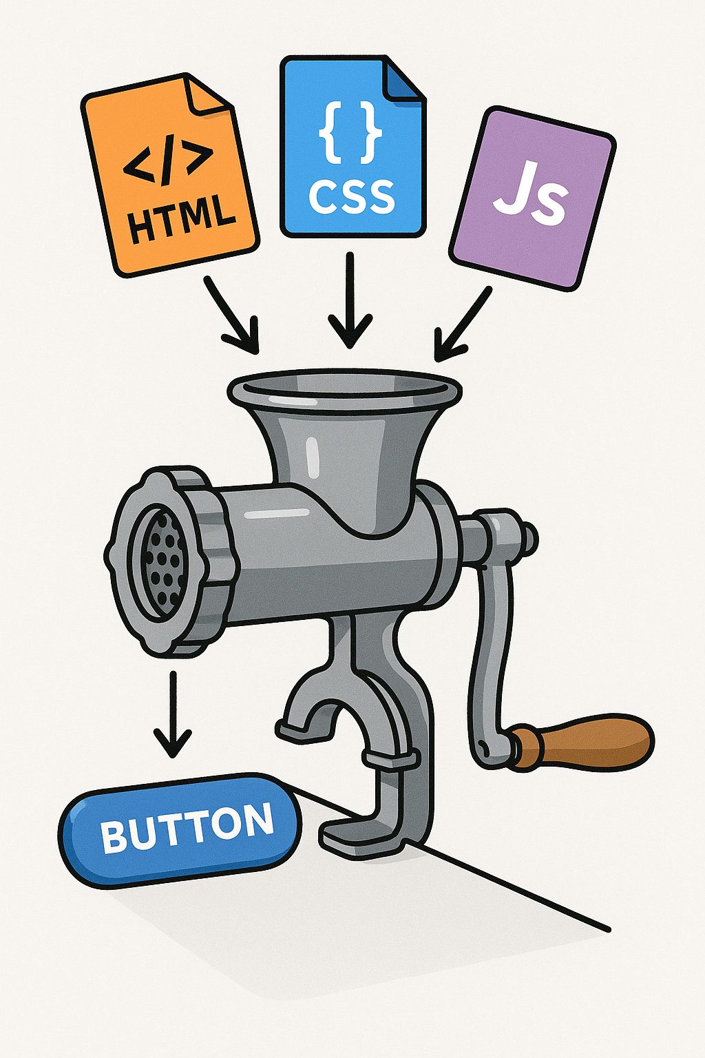 From the machine spout, show a blue button-shaped object labeled "BUTTON" emerging as the final product.