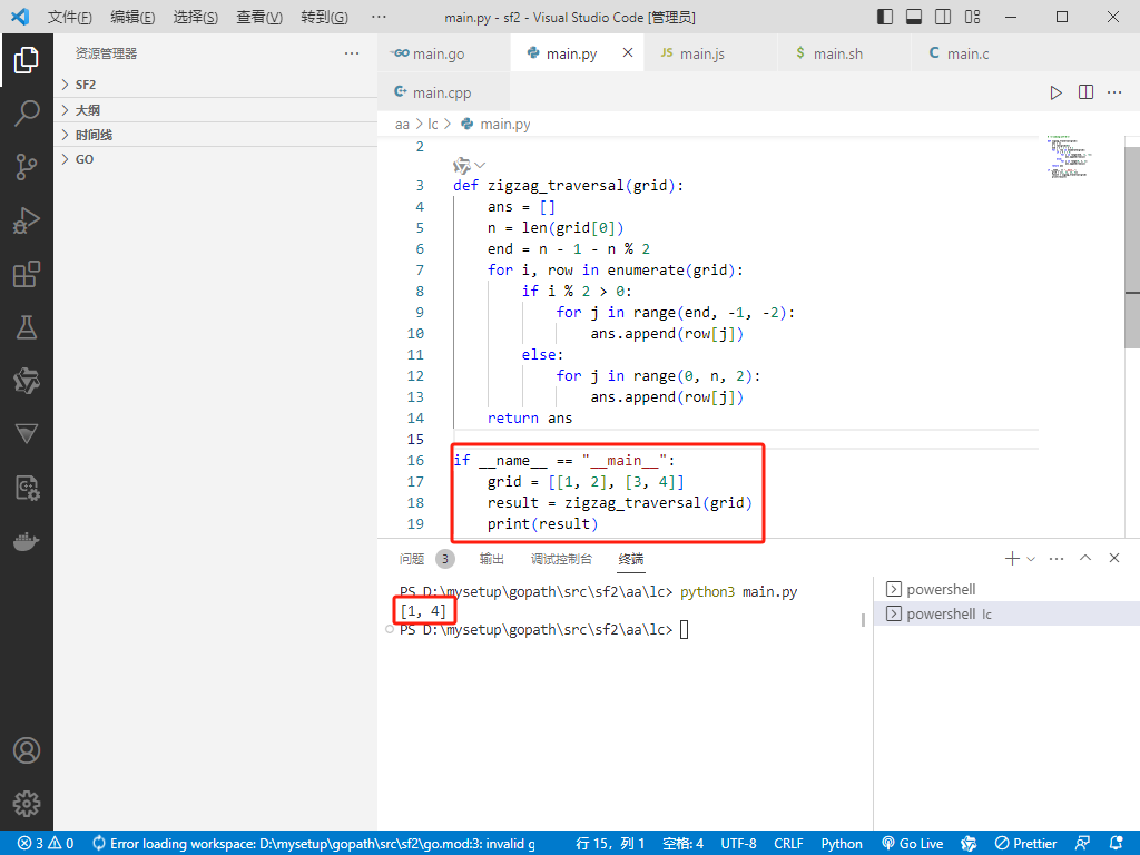 grid[0]。i = 0,是偶数,因此从左到右遍历。grid[0][0] = 1,访问 1。2)。[1]。i = 1,是奇数,因此从右到左遍历。grid[1][1] = 4,访问 4。3)。[4]。[1]。[4]。[1, 4]。m 行。n,但跳过交替单元格后实际访问的列数约为 n/2。O(m * n/2) = O(m * n)。m * n,但实际跳过后约为 m * n/2。O(m * n)(输出空间不计入额外空间时则为 O(1),但通常输出空间也算额外空间)。O(m * n)。O(m * n)(如果输出空间计入额外空间)。如果不计入输出空间,则为 O(1)。.
