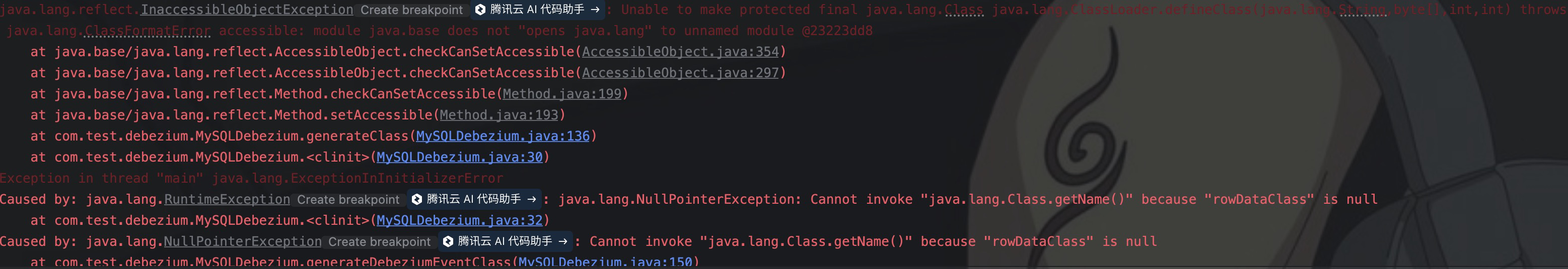 Object a = gson.fromJson(record.value(), debeziumEvent);因为我们使用的 Debezium 的版本必须大于 JDK17,但是 JDK17移除部分反射 API 的默认访问权限,所以如果我们直接运行程序就会报错:
