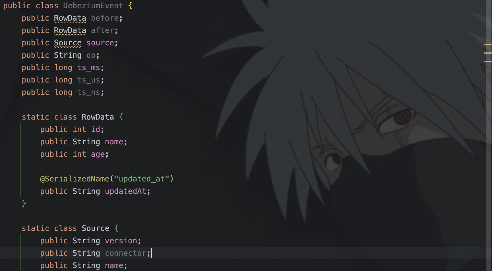 }这样我们就有了一个 rowDataClass,然后就开始回到 gson 解析,开始构造 debeziumEvent 这个参数。
