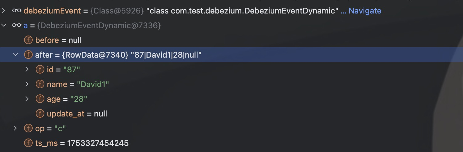 Class debeziumEvent = generateDebeziumEventClass(generateClass("RowData", "id,name,age,update_at", "|"));我们执行程序,可以看到 a 这个变量被 gson 解析成了我们自定义的类。