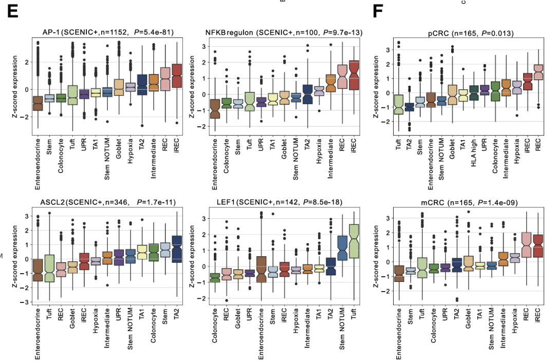 评估了癌症状态下AP-1、NF-κB、ASCL2和LEF1调节子中基因的表达水平。与LEF1和ASCL2靶基因相比,AP-1和NF-κB靶基因在iRECs中表达最高,LEF1和ASCL2靶基因分别在簇状和茎NOTUM以及TA2和干细胞中表达最高。实验确定的AP-1靶基因在pCRC和mCRC的iREC中也以更高的水平表达。