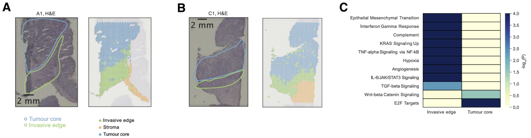 接下来使用cell2location将scRNA-seq数据定义的细粒度细胞类型/状态空间映射到它们的空间位置上。然后使用了 SpatialDE2以识别所有样品中的细胞生态位。研究结果揭示了iREC 在浸润性肿瘤边缘,进一步支持这些状态是假定的转移起始细胞的假设。