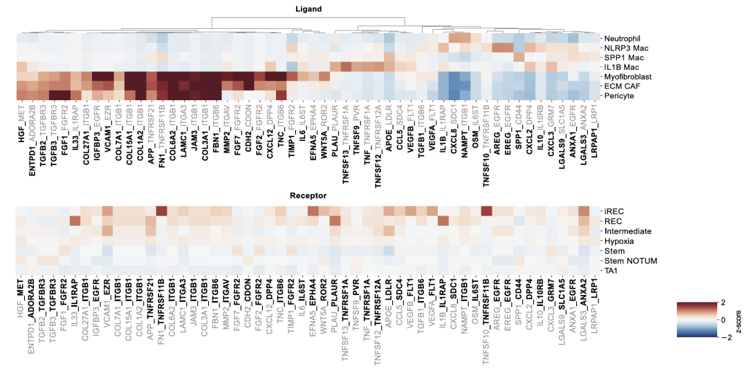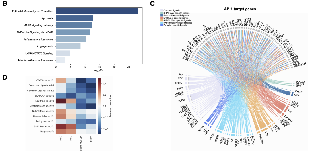 使用了CellPhoneDB鉴定驻留在iREC周围空间生态位中的细胞状态中富集的受体-配体对。接下来,为了确定哪些配体可能促进癌细胞中的炎症再生程序,使用 NicheNET 确定了预测诱导AP-1和NF-κB调节子的配体。结果揭示了可能激活AP-1靶基因的CAF和髓系配体的候选列表,相应的受体在(i)REC中上调。