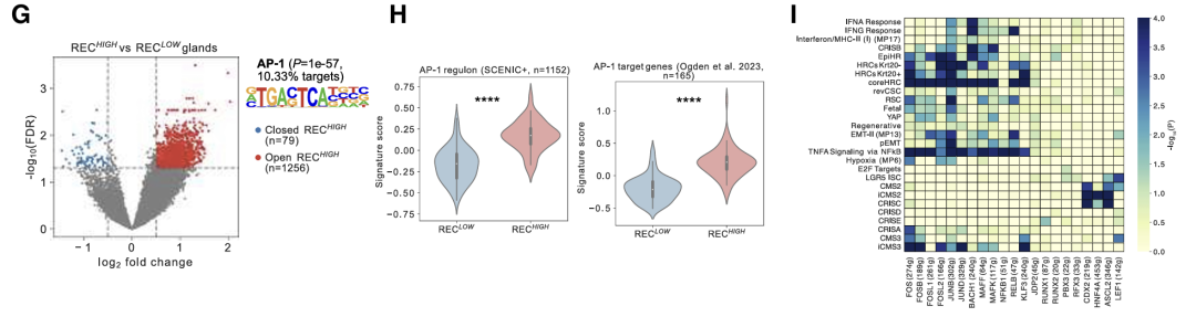 AP-1基序在 REC 中差异开放的染色质区域显着富集腺体和AP-1靶基因的更高表达。对TF调节子内基因的GEA显示,LGR5 ISC特征在ASCL2和LEF1调节子中显著富集,而许多富含在iRECs中的基因特征在AP-1家族成员中也显著富集,包括与预后不良(CRISB和EpiHR)和转移起始细胞(HRC)相关的特征。
