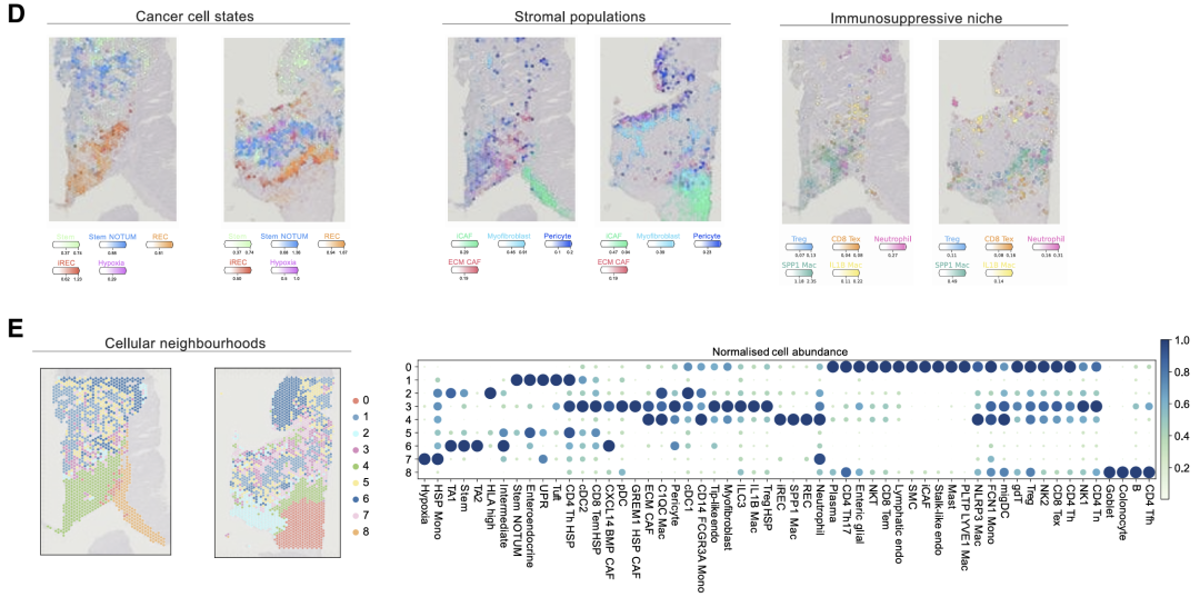 对所有六个 LM 样本的联合分析显示,空间隔离的癌症状态被组织成不同的局部邻域。iREC与pCRC中的侵袭边缘类似,与血管周围细胞,ECM重塑CAF和肌成纤维细胞聚集在免疫抑制生态位中,包括SPP1 TAM,IL1B / NLRP3 TAM,中性粒细胞,耗竭的CD8T细胞和Treg(邻域0和5,邻域3的低丰度)。干细胞驻留在自己的生态位中。
