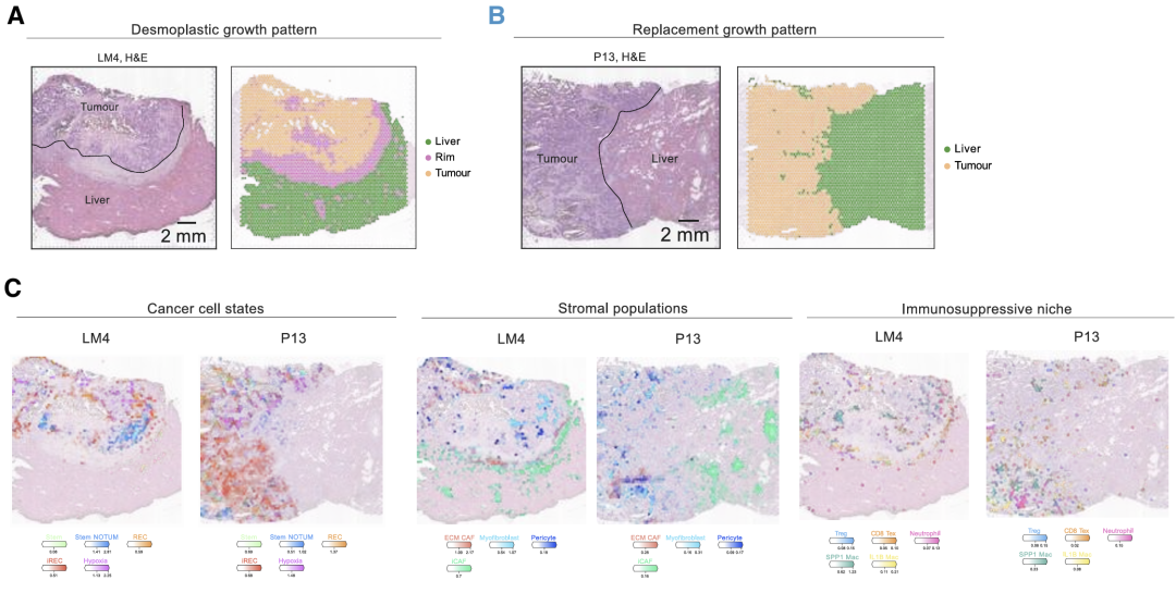 LM 表现出不同的组织学生长模式,反映了癌细胞与周围肝实质相互作用的不同方式。结缔组织增生性生长模式(样品 LM4)的特征是由成纤维细胞和细胞外基质组成的结缔组织增生性胶囊,有效地包裹来自肝脏的转移性癌组织。相比之下,替代生长模式(样品 P13)中的癌细胞在肝细胞之间直接接触。iCAFs 在肝脏部位和肿瘤-肝脏界面富集,ECM CAF 在肿瘤-肝脏边界和肿瘤部位富含 C1QC 和炎性 IL1B 巨噬细胞,而肌成纤维细胞和免疫抑制性 SPP1 巨噬细胞浸润肿瘤核心。