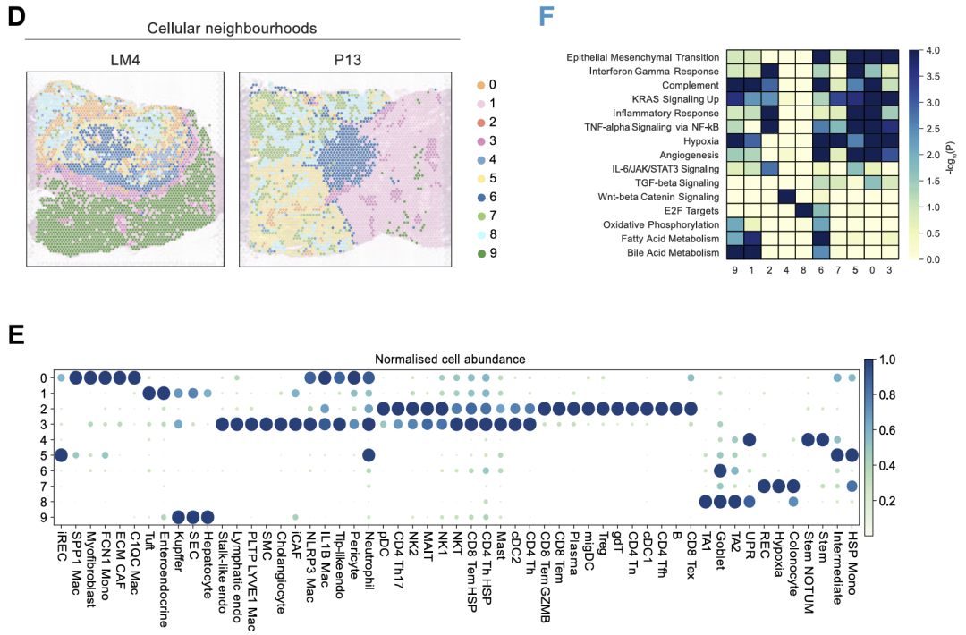 细胞邻域1和9表示肝实质,主要由肝细胞和库普弗细胞组成,它们分别对替换和结缔组织增生模式具有特异性。邻域3包括免疫调节CAF和免疫抑制细胞,主要富集在结缔组织增生边缘,而邻域2主要由免疫细胞组成,对样品CRC11和CRC09具有特异性。在iREC和免疫富集邻域(邻域 0、2、3 和 5)中上调的基因富集了EMT、IFN-γ 反应、KRAS信号传导和血管生成,而stem富集的生态位(邻域 4)富集了WNT信号通路。