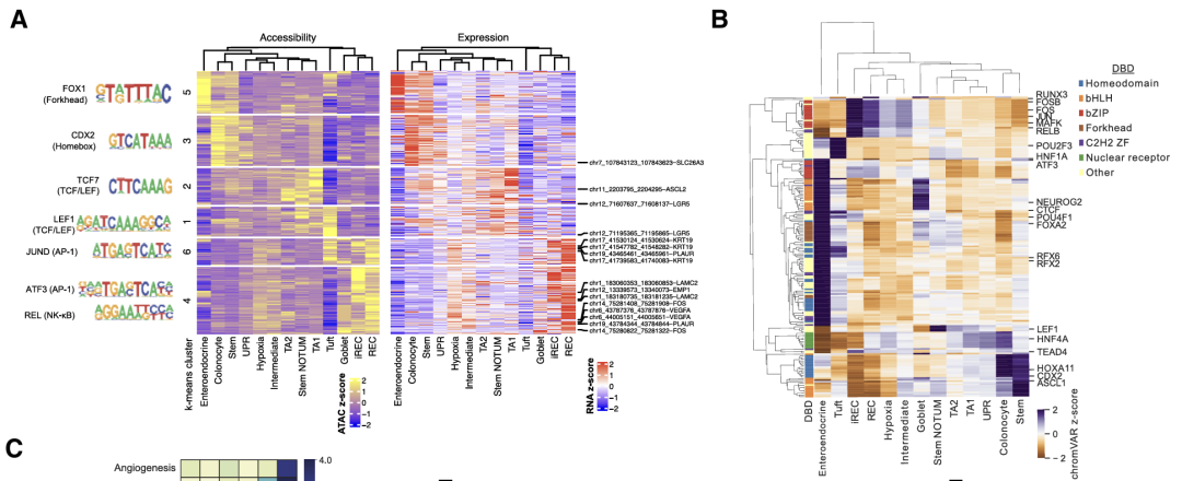 为了预测癌细胞状态的转录调节因子,接下来研究了mCRC数据集中可访问的染色质景观。为了识别假定的增强子,将基因的表达水平与远端染色质区域的可及性相关联,并鉴定了1,444个假定的增强子-基因连锁(PE-GL)。PE-GL的k-means聚类识别出与不同癌症状态相关的聚类,表明表观遗传调控。鉴定出细胞类型特异性PE-GL可能驱动干细胞(LGR5和ASCL2)、结肠细胞(SLC26A3)、iREC(EMP1、PLAUR和LAMC2)和缺氧(VEGFA)标记基因的表达。