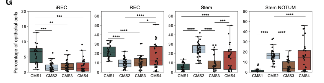 使用共有分子亚型(CMS)对肿瘤进行分类,stem和stem NOTUM状态在CMS2肿瘤中更为丰富。REC富集在富含免疫的CMS1和富含基质的CMS4肿瘤中,而iREC富集在CMS1肿瘤中,进一步表明由于与免疫系统的相互作用而上调炎症特征。