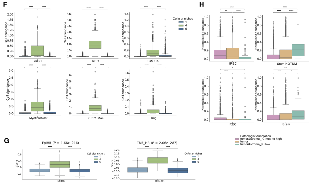 相比之下,肿瘤核心(邻域 1 和 6)的干细胞含量丰富。(一)侵袭边缘的REC与肌成纤维细胞和ECM CAF以及免疫抑制细胞(如SPP1巨噬细胞,中性粒细胞,耗竭的CD8T(Tex)细胞和Treg)共定位。与stem群相比,iREC在肿瘤-基质-免疫界面中显著富集,而stem群在肿瘤和肿瘤-基质低区域更丰富。