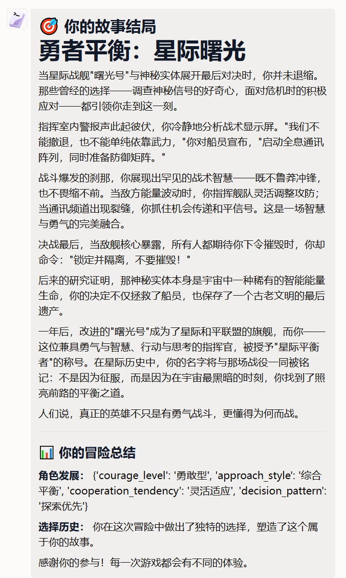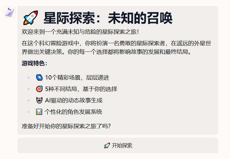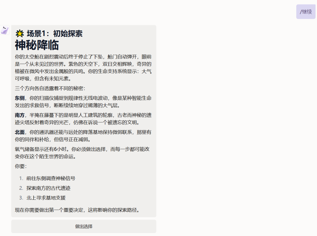 这个游戏是一个AI驱动的动态故事游戏,有10个精彩场景,层层递进,最终基于你的选择有5种不同结局,有专属于自己个性化的角色发展系统。