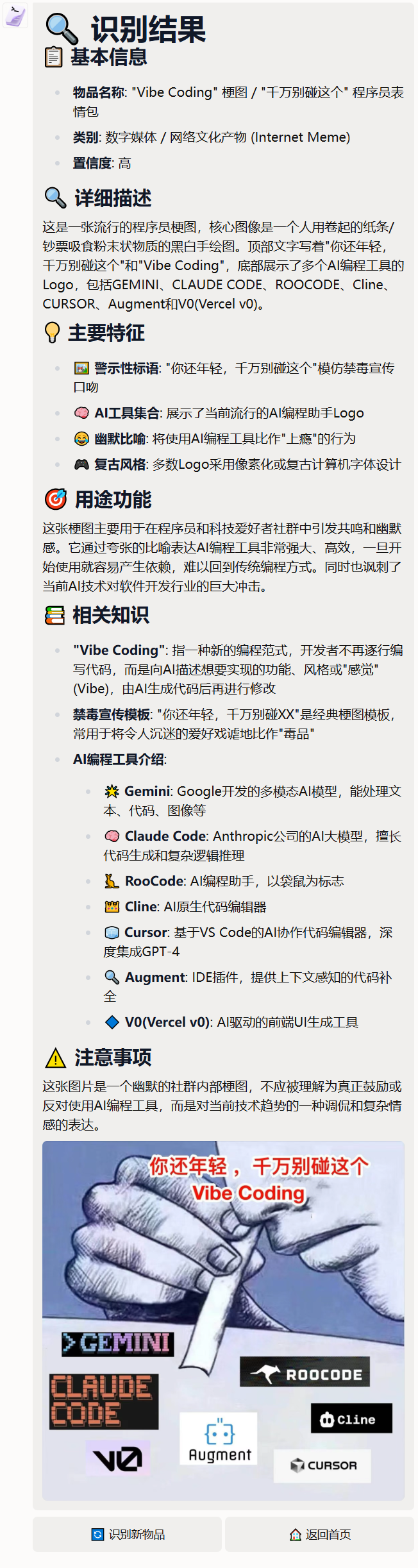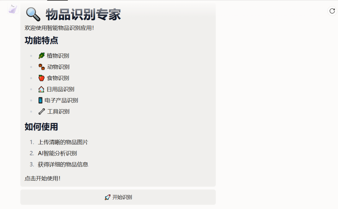 我需要一个物品识别 App。用户可以用摄像头拍摄一个物品(比如植物、动物或特定商品),App 应该能识别出这是什么,并显示相关的简介信息。