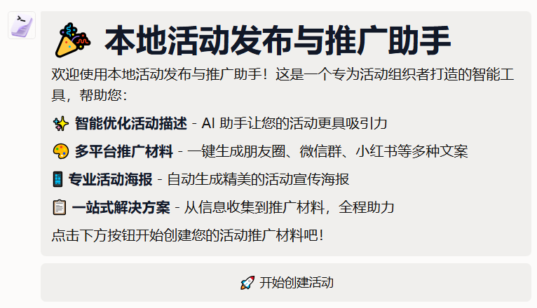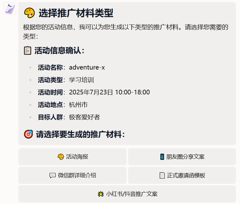 能够生成常用的宣传海报、朋友圈文案、群介绍、邀请函、小红书笔记等等。