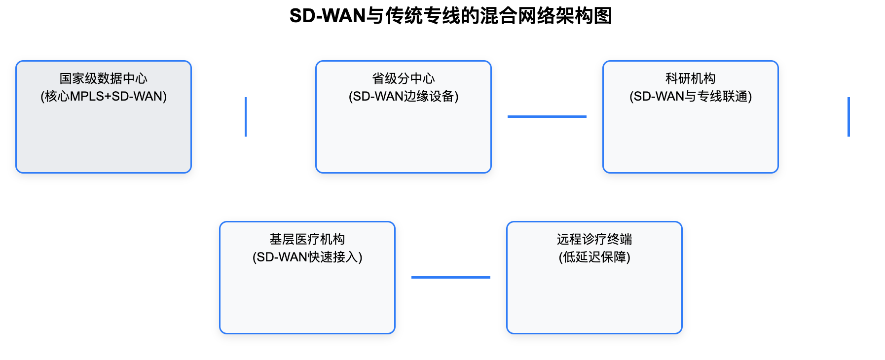 以下是SD-WAN与传统专线结合的混合网络架构图,展示了国家级数据中心、分支医院以及基层医疗机构间的高效互联方式。