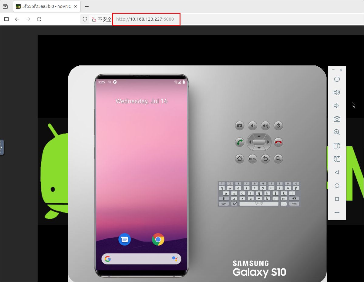 (2)运行完成后,在浏览器输入 http://本地IP:6080(本例http://10.168.123.227:6080),即可web访问图形化界面的Android模拟器。(首次打开加载较慢)