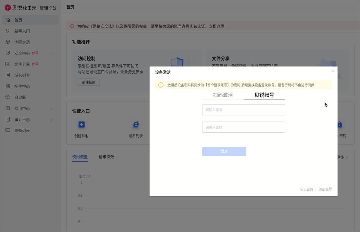 (2)首次登录,需先进行设备激活。贝锐花生壳提供扫码激活和贝锐账号激活两种方式。