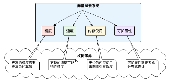 随着向量维度的增加,传统的搜索方法会遇到"维度灾难"问题: