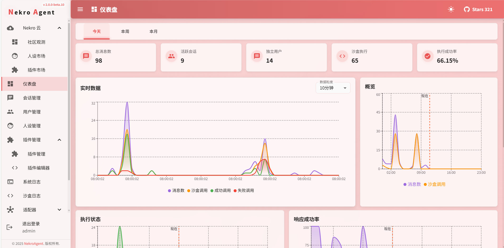 NekroAgent 是通过强大灵活的提示词构建系统,引导 AI 生成准确的代码并在沙盒中执行,通过 RPC 通信来与真实环境交互,有着可视化的WebUI后台可以轻松查看修改参数、装配插件。Nekro Agent 的核心是面向 输入/输出流 设计的。适配器(Adapter)作为连接外部平台的桥梁,仅需实现对具体平台消息的接收(输入流)和发送(输出流)。所有复杂的业务逻辑,如会话管理、插件执行、沙盒调用等,都由 Nekro Agent 的核心引擎自动接管和处理。这种设计确保了极高的扩展性和维护性,让开发者可以专注于实现适配器本身的功能,而无需关心核心的复杂实现。支持多操作系统部署如Linux,Windows,MacOS。