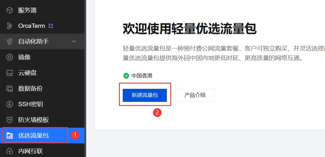 在轻量应用服务器控制台左侧菜单中,找到轻量优选流量包,如下图所示,然后点新建流量包,根据实际需要选购流量包即可。