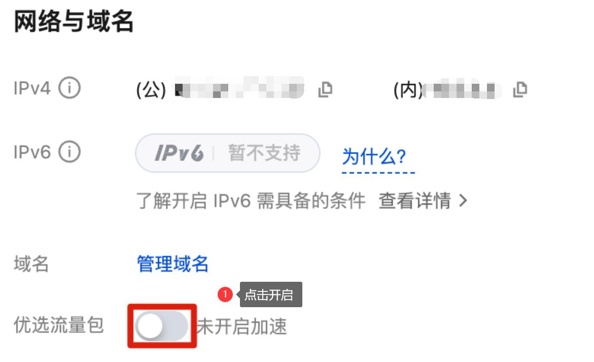 找到中国香港地域需要开启优选加速的轻量应用服务器,单击实例 ID 进入实例详情页。在实例详情页的网络与域名模块,优选流量包默认是未开启加速状态,单击开启优选流量包。