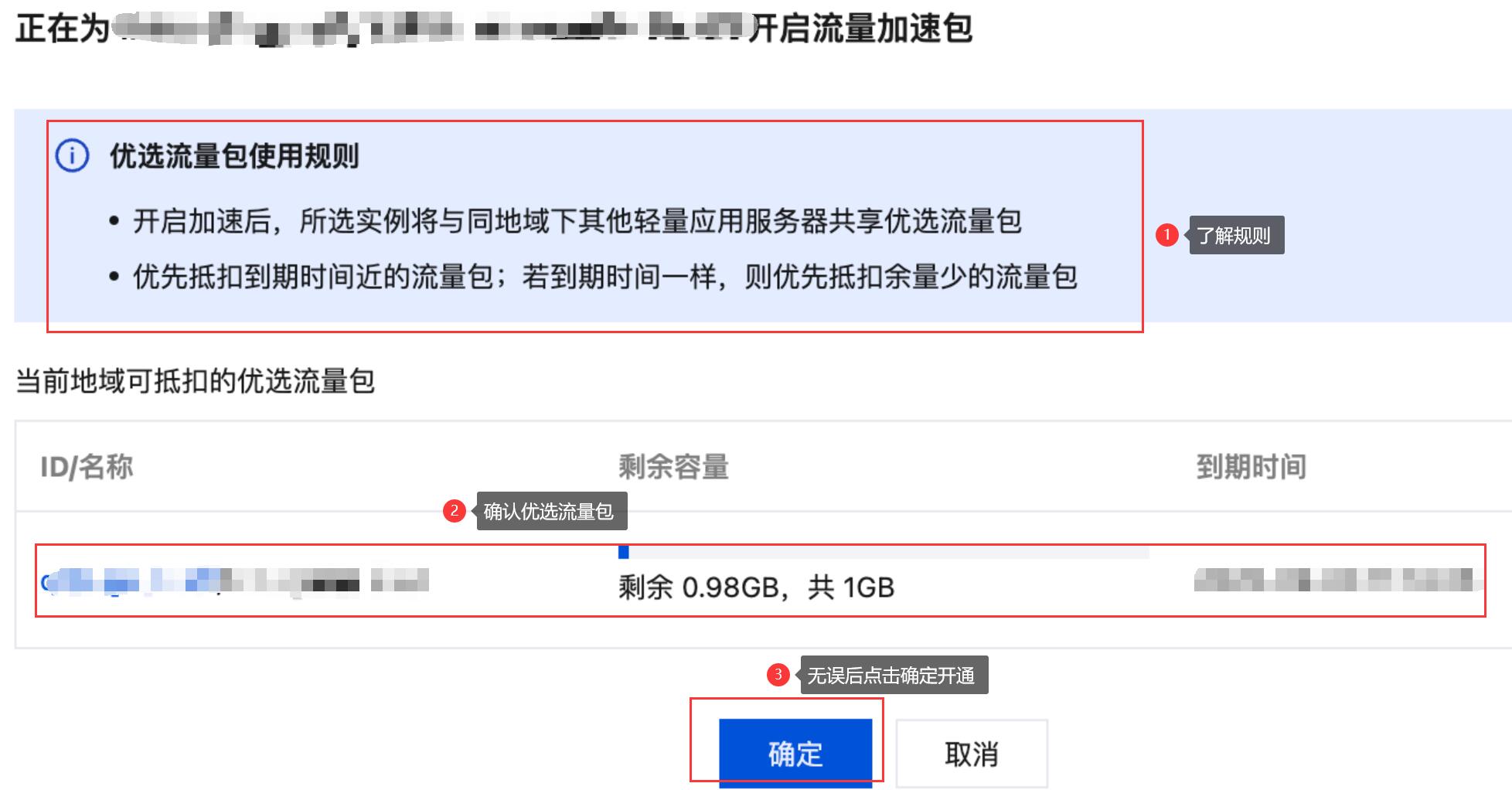 在弹出的界面中,将显示该地区下有效的优选流量包,确认无误后,单击确定即可为实例开启流量加速。
