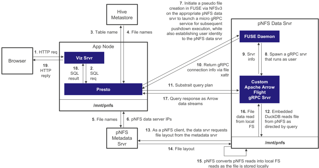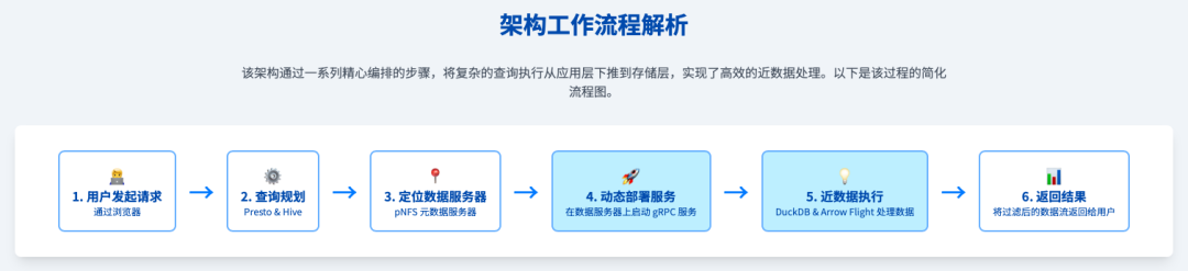 这种架构的核心在于将查询处理从计算节点转移到存储节点。通过使用标准的pNFS协议和开源工具,如Presto、Apache Spark和Apache DataFusion,系统能够在数据所在的位置执行查询。这种方法不仅减少了不必要的数据传输,还提高了分析的速度和效率。
