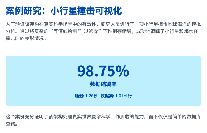 在实际应用中,这种架构已经显示出显著的成效。例如,在模拟小行星撞击地球海洋的过程中,通过将过滤操作下推到存储层,数据移动和客户端内存使用减少了99%。工程师通过本地笔记本完成原本需百万美元级超级计算机的分析任务。