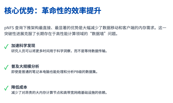 为了解决这一问题,Los Alamos与Hammerspace和SK hynix合作,开发了一种基于pNFS的查询推送架构。这一架构通过在存储层执行复杂的查询,显著减少了数据移动和下游系统的负载。