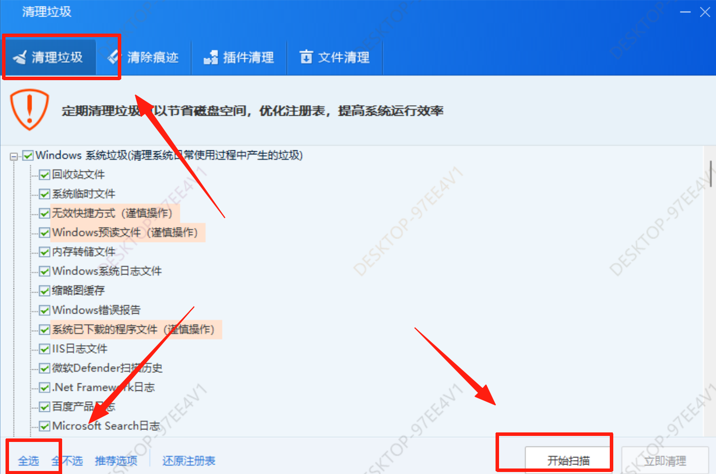进入到垃圾清理页面,包含四个功能,垃圾清理、清楚痕迹、插件清理、文件清理,我们在垃圾清理进行全选,然后开始扫描。