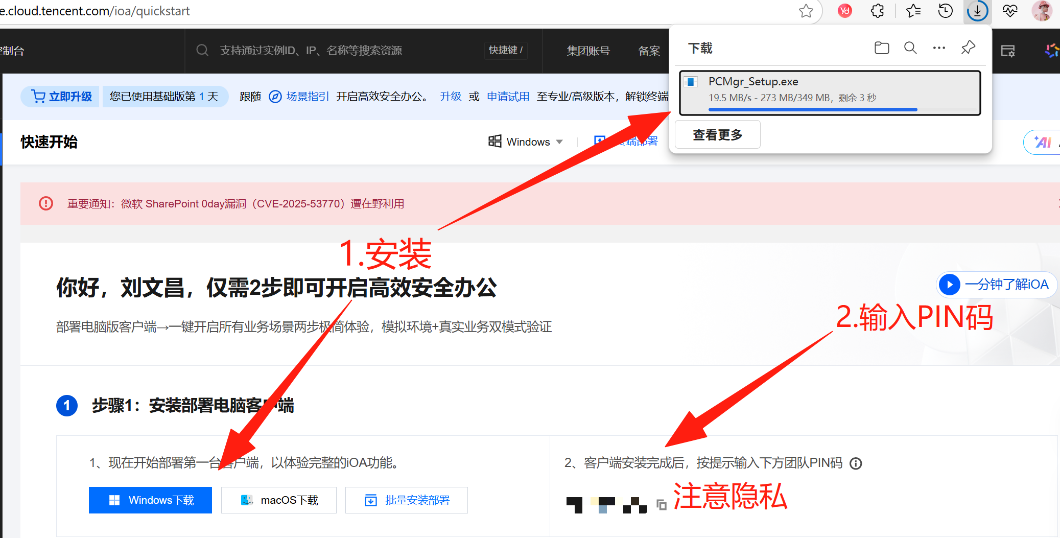 3.下载Window下载,安装部署电脑客户端,在安装好后按提示输入下方团队PIN码。